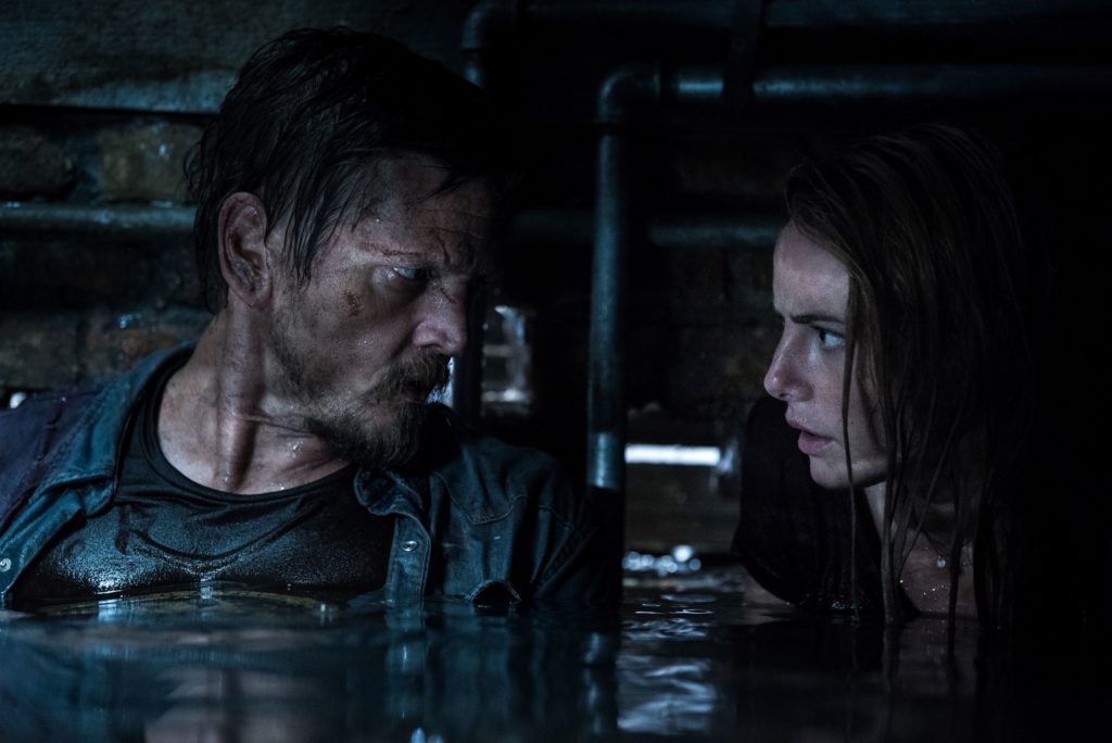 Esse é um ponto bastante positivo do filme, apesar de você ter ciência da presença dos crocodilos no recinto (sim, claro que eles vão ter que lidar com mais de um ou seria tudo mais fácil) e saber que eles vão atacar Haley e seu pai Dave (Barry Pepper), os sustos não são tão premeditados. A produção se vale quase que inteiramente dos jump scares para te assustar, porém de um jeito pouco óbvio. O que temos é constantemente um clima de tensão criado justamente pela situação de perigo constante em que os protagonistas se encontram, dessa maneira é mais difícil prever o momento exato em que o susto virá.